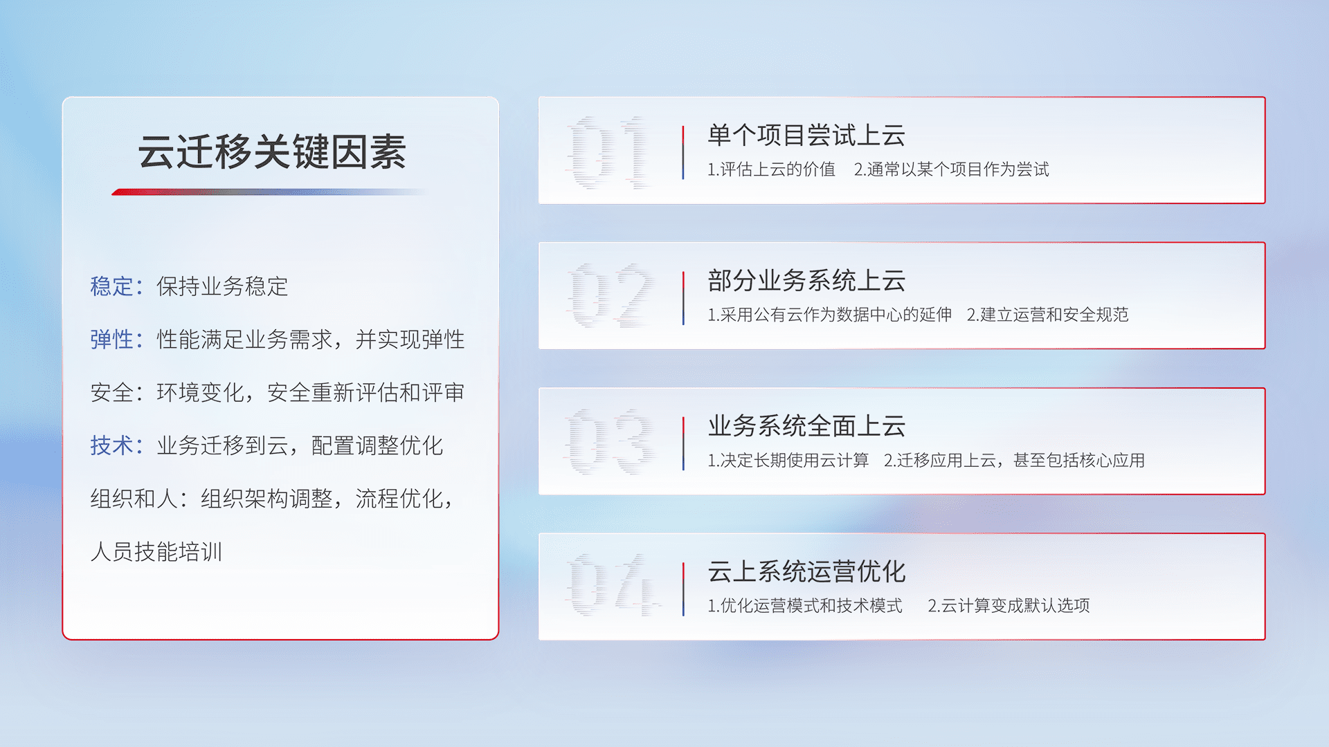 结合实际业务,,,,从规划设计、、、、云平台选型、、云原生改造、、数据迁移、、、集成交付,,,,迁移全过程为客户识别最佳上云路径,,,做好风险识别管理,,,设计网络架构、、身份权限、、、安全审计合规、、操作审计、、日志审计、、监控告警策略、、多站点容灾设计等,,对云上基础设施进行整体规划,,,,提升IT治理水平,,,以满足弹性、、高可用、、高性能的需求。。。