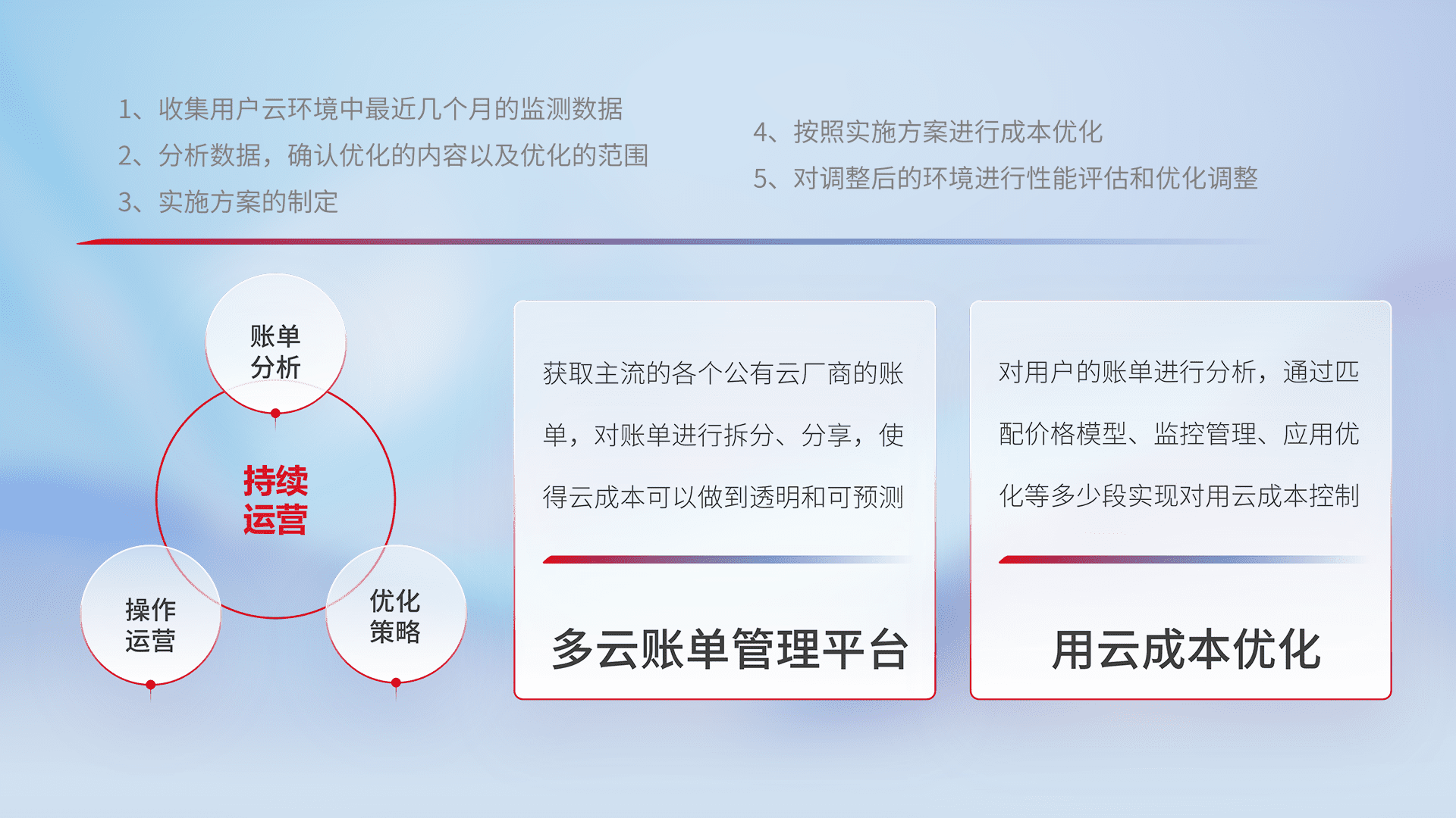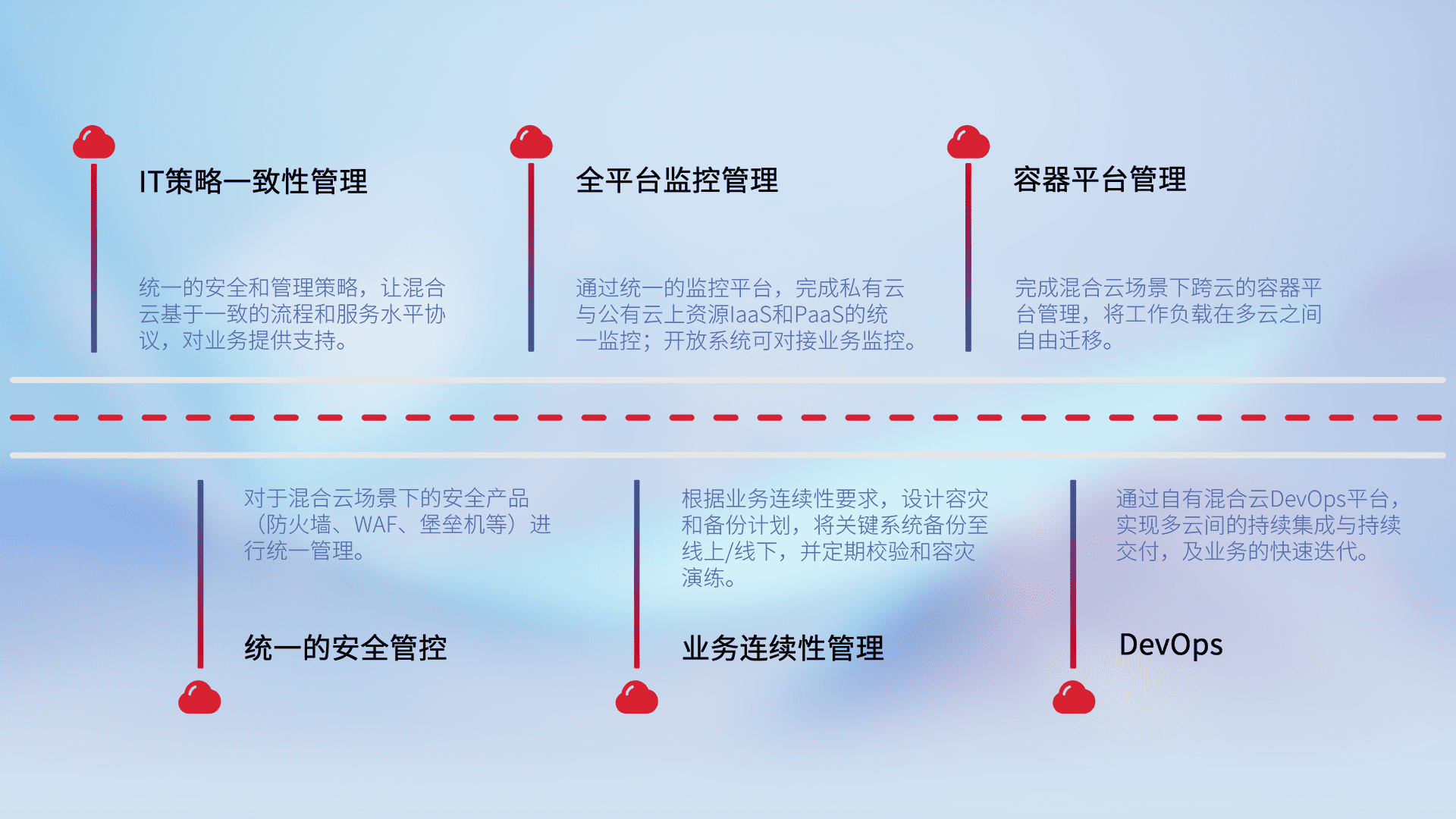 通过多云纳管,,以统一的资源数据模型把客户的云资源进行抽象和封装,,,进而实现对多云资源的统一操作,,,保障云资源管理的可靠性、、稳定性与可用性。。。量身定制化运维内容,,,配置、、开发运维、、、补丁管理、、备份、、、监控、、、认证和访问管理、、审计和日常巡检等,,保障在用云过程中的可靠度,,,稳定度以及高可用率。。
